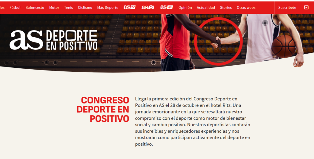 Es para mí un placer compartir con vosotros que este próximo lunes 28, participaremos en el primer Congreso Deporte en Positivo del Diario AS, que se celebrará durante todo el día en el Hotel Ritz de Madrid.